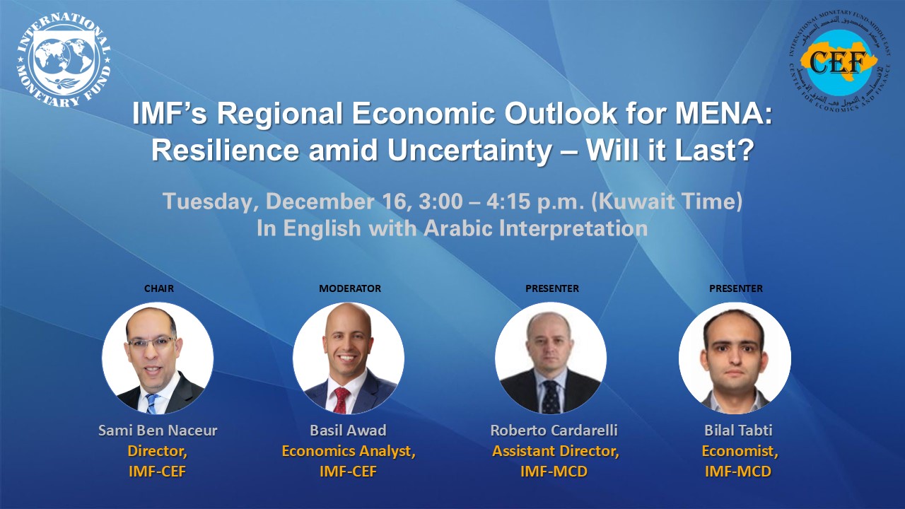 The IMF-Middle East Center for Economics and Finance (IMF-CEF) and the Middle East and Central Asia Department (IMF-MCD) are pleased to invite you to a webinar to discuss IMF’s Regional Economic Outlook for MENA: