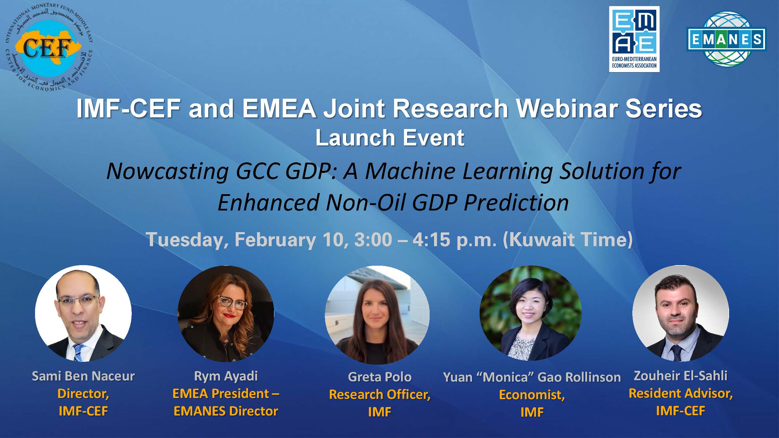 The International Monetary Fund Middle East Center for Economics and Finance (IMF-CEF), in partnership with the Euro-Mediterranean Economists Association (EMEA) and in collaboration with the EU-Mediterranean and African Network for Economic Studies (EMANES), successfully launched the IMF-CEF & EMEA Joint Research Webinar Series on Regional Economic Challenges in the Arab and Mediterranean regions on Tuesday, February 10, 2026. The inaugural session was chaired by Mr. Moez Souissi (Deputy Director of the IMF-CEF) and Ms. Rym Ayadi (President of EMEA and Director of EMANES), who delivered the opening remarks. Mr. Zouheir El-Sahli (Senior Economist at the IMF-CEF) moderated the event.